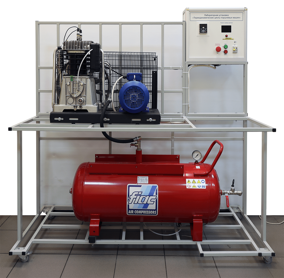 Лабораторный стенд «Термодинамические циклы поршневых машин» обеспечивает проведение лабораторно-практических занятий в учреждениях начального профессионального, среднего профессионального и высшего профессионального образования, по изучению конструкции и принципа работы поршневого компрессора, а также термодинамические процессы в поршневых машинах. Установка выполнена согласно ТУ 32.99.53–001–09519063– 2019 и имеет соответствующий сертификат производителя ГОСТ Р и сертификат качества ИСО 9001-2015 на данный вид продукции.