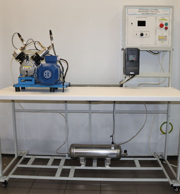 На основании лабораторного стола жестко закреплена столешница, которая выполнена из диэлектрического материала. На лабораторном столе размещен компрессор (с двухступенчатым сжатием) и ресивер. Так же на стенде установлены все необходимые датчики (температуры, давления и расхода) для проведения лабораторных работ.