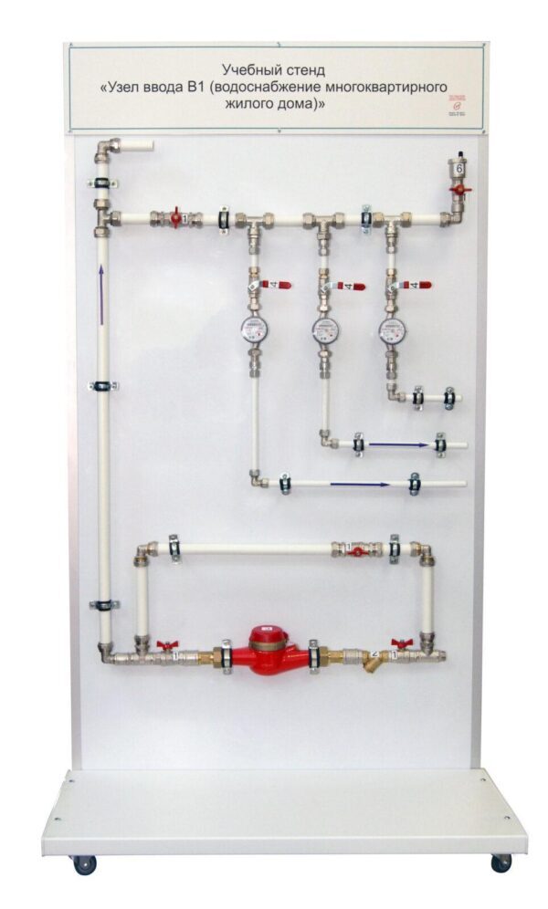 Учебный стенд «Узел ввода В1 (водоснабжение многоквартирного жилого дома)» предназначен для проведения практических занятий.