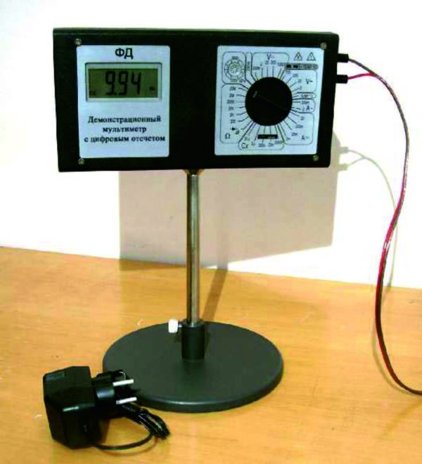 Мультиметр ФД предназначен для использования в демонстрационных опытах при организации лекционного эксперимента при чтении лекций по курсу «Физика» в качестве измерительного прибора. Мультиметр также может использоваться и в лабораторных работах, при регулировании и ремонте различного оборудования и т.д. Мультиметр используется для измерения напряжения и силы постоянного тока, среднеквадратичного значения силы и напряжения переменного тока синусоидальной формы кривой, сопротивления постоянному току, электрической емкости конденсаторов, коэффициента статической передачи тока биполярных транзисторов, частоты, температуры, тестирования p-n переходов и проводимости.